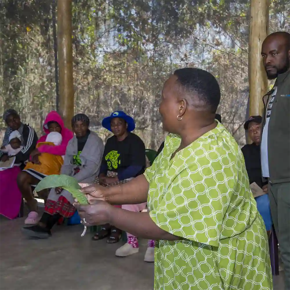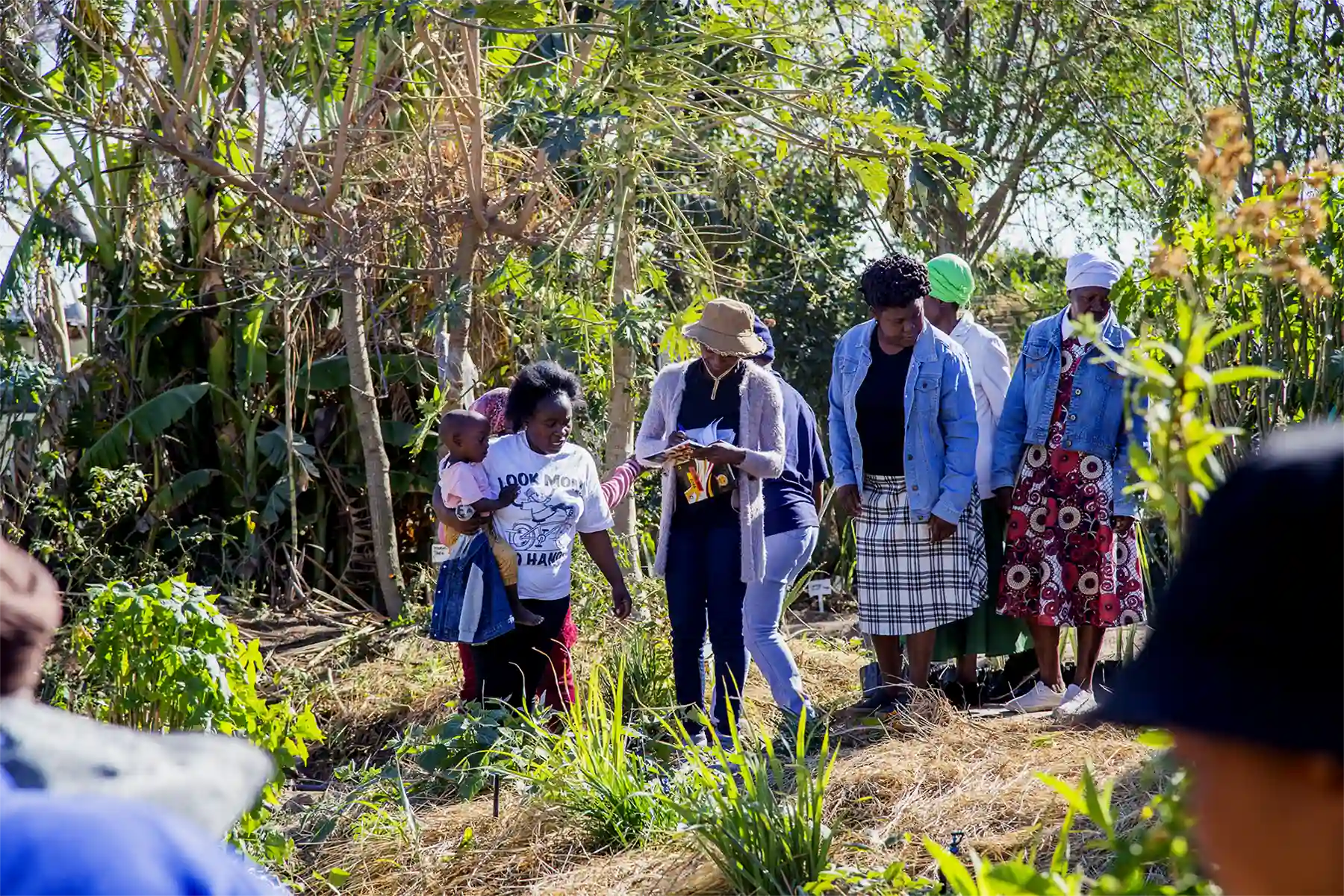 Early in July, about half an hour before the 10 Trees class was to begin, women had started gathering outside the Center for Women’s Independence. This vibrant pink building houses Zingela Ulwazi Trust, a community nonprofit based in Orpen Gate Village, a small village settlement in Mpumalanga province, South Africa. Despite the sharp chill of a July winter, their anticipation was palpable. Some chatted animatedly near the shop across from the center, while others stood by the front gate, pen and paper in hand, ready to learn. Late arrivals were rare—even with babies and toddlers in tow. Their punctuality wasn’t driven by fear of reprimand, but by an eagerness to savor every moment of class. From a distance, Trygive Nxumalo, Director of Permaculture Education and Community Development, lifted his voice in the popular Xitsonga hymn “Angakona waku fana na Yeso” (“There is no one like Jesus”), leading the group into a joyful song and dance. Once the festivities subsided, the women moved inside the center, settling into chairs arranged in a welcoming circle.