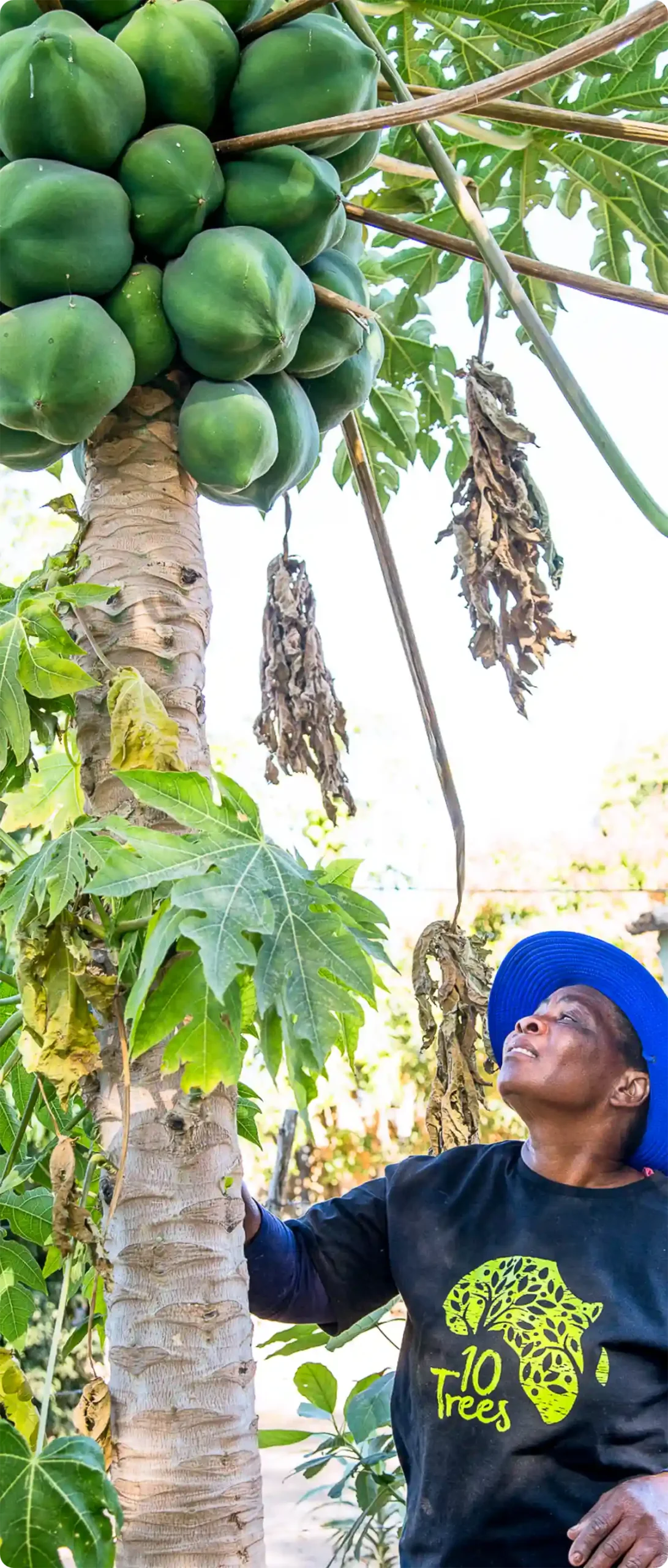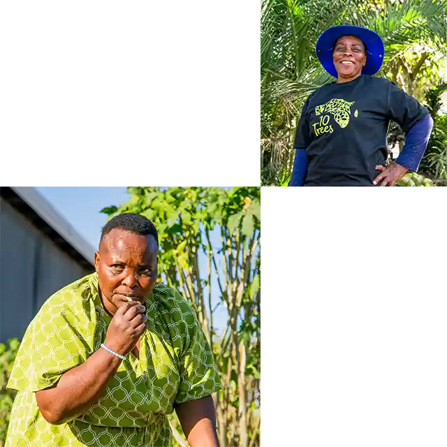 Thandi Manganye joined 10 Trees in June 2024 after seeing its impact on the wider community. A diminutive but strong woman with a warm smile, she’s known as one of the friendliest at the Center for Women’s Independence. “10 Trees has been a good program for me,” she said, showing us a garden that, she admitted, had fallen victim to the harshness of the Lowveld winter. A tall papaya tree towers over her white house, while her grandchildren peeked from the window as she pointed out indigenous medicinal herbs and an assortment of beans that she’d planted. Like Winnie, she values the economic relief the program and Permaculture Explorers have provided. “In this program, we’ve learned how to plant trees and how to protect them, because trees protect us,” Thandi said. “We’ve been able to survive and make a living.” In May, she was named a tree mentor for her dedication to the program, a moment of celebration for her peers as much as it was for herself.