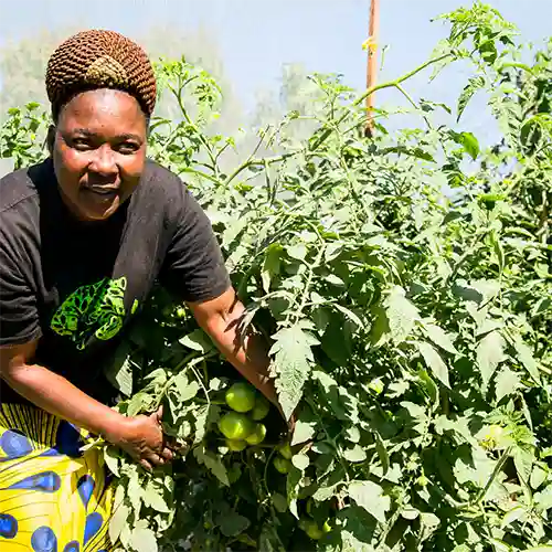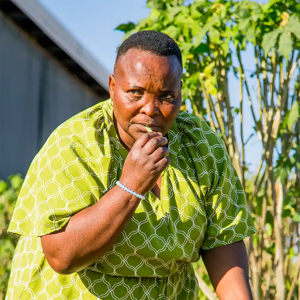 Despite these challenges, 10 Trees beneficiaries like Winnie Shongwe have found hope. Joining the program in August 2024, Winnie is known for her quiet nature. “I’m not a person who talks or smiles a lot,” she said, opening the gate to her prosperous home garden. Winnie’s garden, protected by 10 Trees’ netting, now thrives with spinach, peppers, and okra—living symbols of abundance through agency. Not too long ago, she had to ask neighbors for food. “They couldn’t even give me a beetroot leaf,” she said, eyes glistening in the sunlight. She understands their reluctance wasn’t out of malice but necessity. “Life here isn’t easy. Back then, I didn’t have money to feed myself or my family. I struggled a lot,” she admitted, while watering her vegetables. Yet she reflects